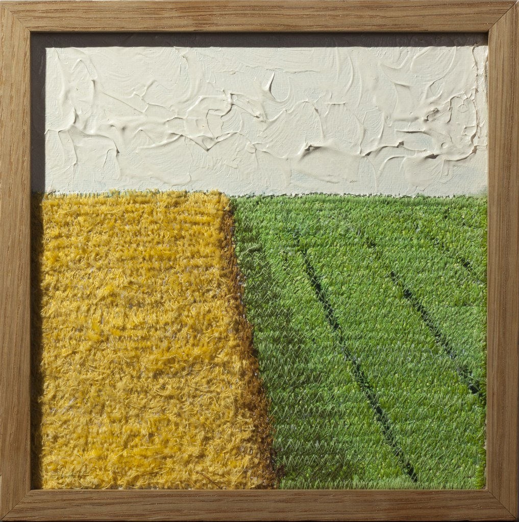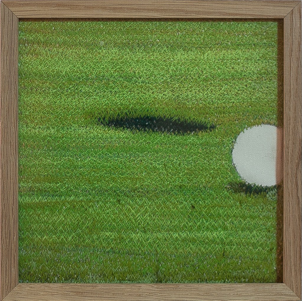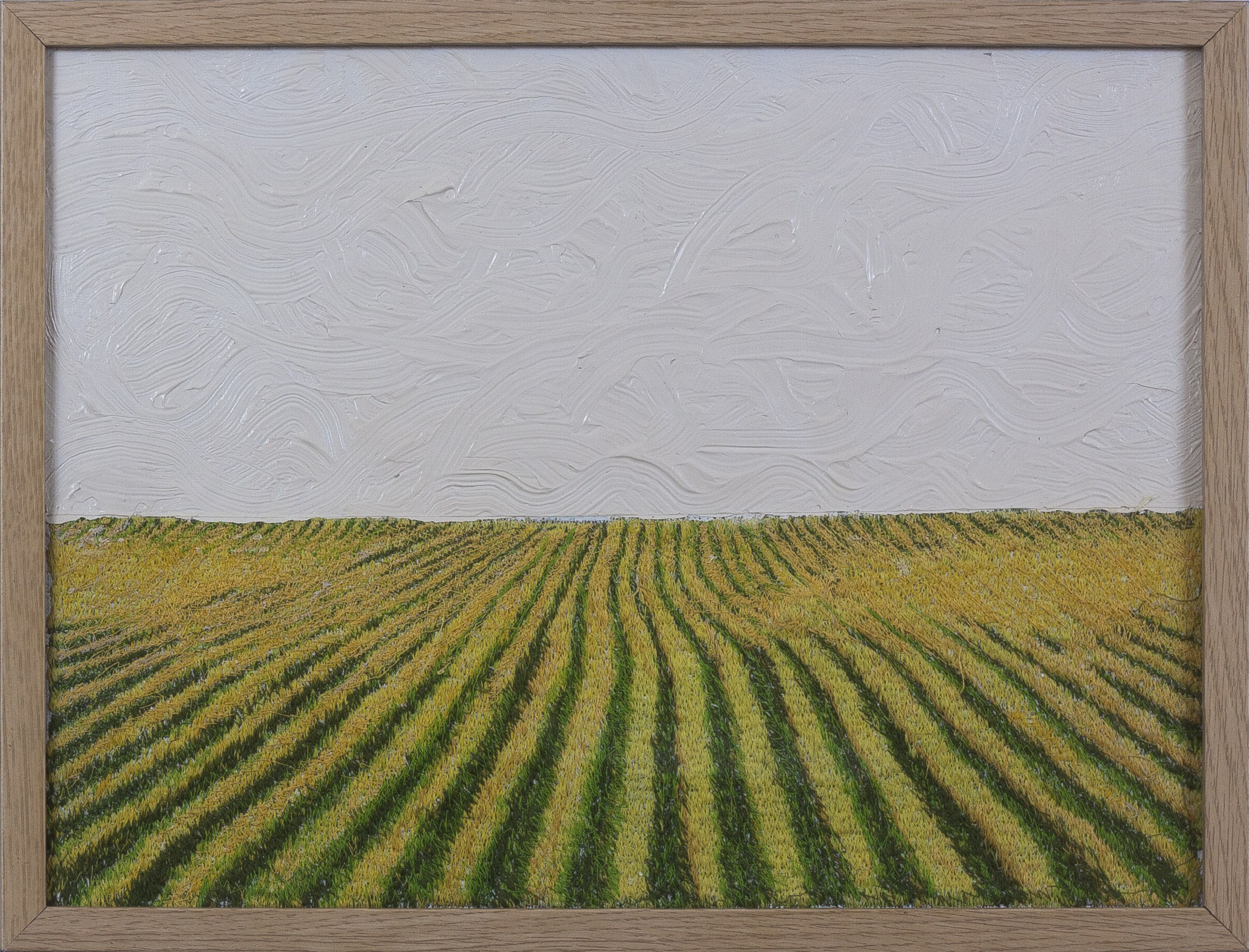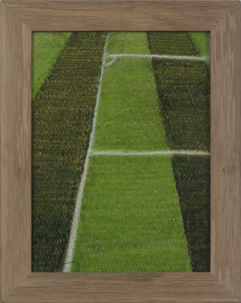 Sur une reproduction des scènes pastorales de Millet, chinée dans les brocantes, Frédéric Rillardon en redessine mécaniquement les sillons à l’aide de sa machine à coudre et, métamorphosant les champs de l’Angélus en stade de football, nous présente une société dans laquelle le sport, l’argent et le chronomètre tiennent désormais lieu de religion, tandis que les populations peinent à se nourrir. Le paysage devenu terrain de jeu…