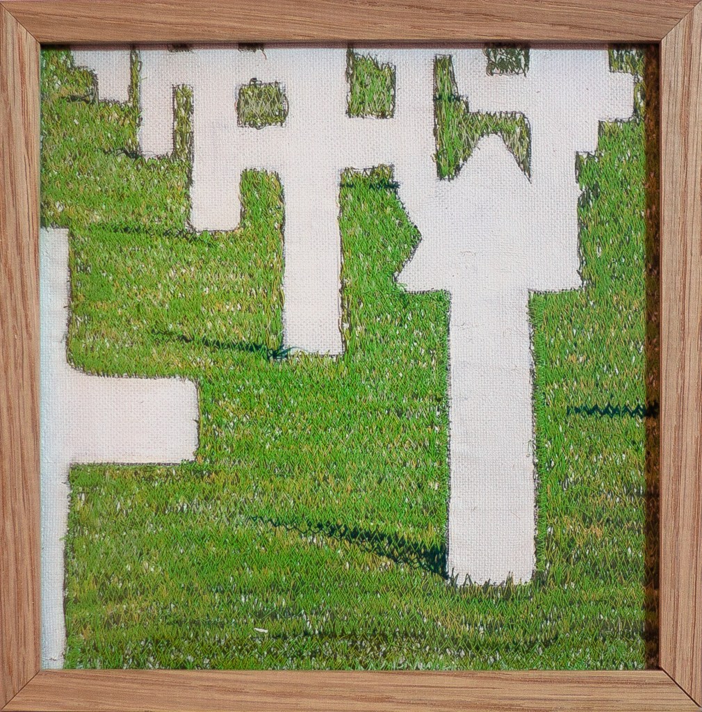 Plus loin, Frédéric Rillardon met en scène des environnements paysagers dans lesquels l’action et la présence humaine sont paradoxalement d’autant plus visibles qu’elles sont « gommées », découpées sur fond blanc, tout comme les alignements de croix, clin d’œil à la thématique de la vanité et de la nature morte, symbole ultime du lien unissant l’homme à la terre.
